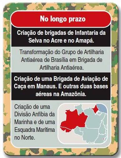 Como sempre, as principais modificações atingem a maior das forças, o Exército, que denominou Estratégia Braço Forte o seu planejamento estratégico para os próximos anos. A Braço Forte tem dois programas, Amazônia Protegida e Sentinela da Pátria. No primeiro, serão criados 28 pelotões de fronteira, cada um deles com 50 integrantes, além de uma brigada com sede em Manaus. Com isso, o efetivo atual na Amazônia deve quase dobrar, passando de 25 mil para 49 mil militares (22 mil dos 59 mil previstos no reforço de contingente brasileiro devem ir para essa região).