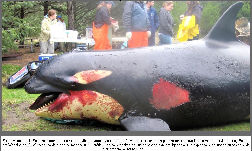 Que triste isso, pena que ela não é a unica que morre por ação de treinamentos militares, muitos outros cetáceos como os golfinhos morrem ou se suicidam, pela ação dos sonares de navios militares, muitos acabam ensurdecendo e se matam de tanta dor ou morrem por causa de hemorragias internas na região dos tímpanos...